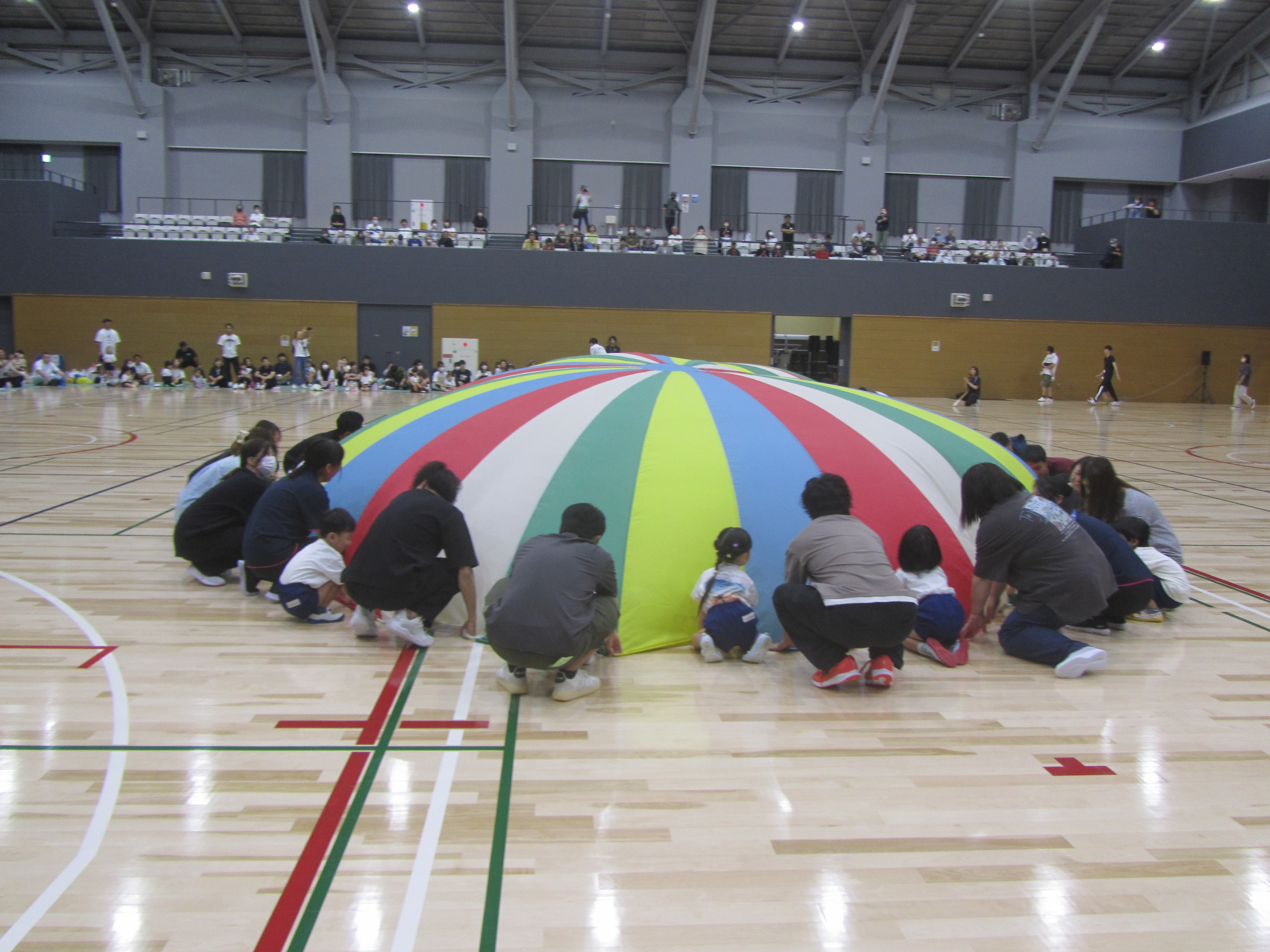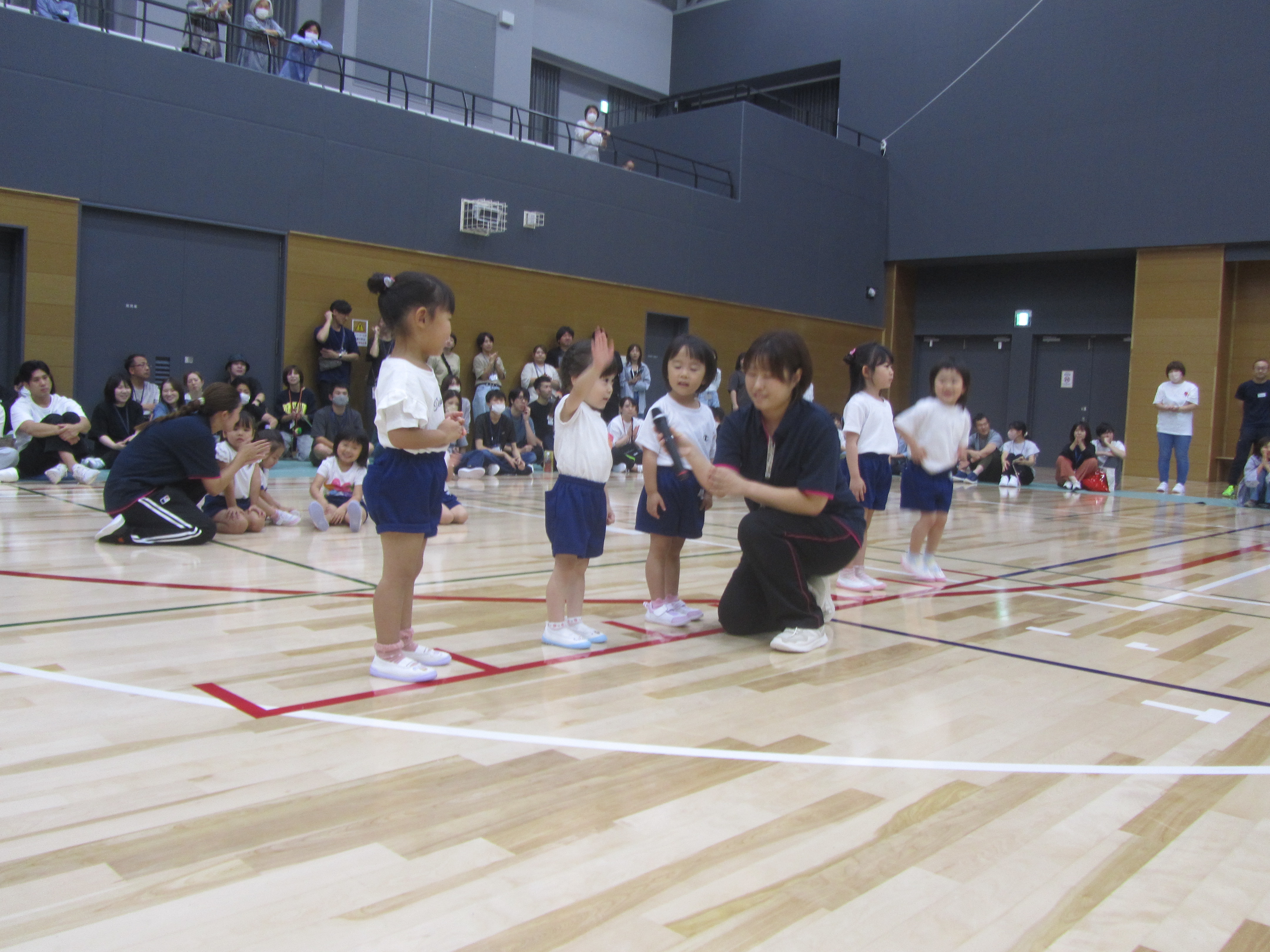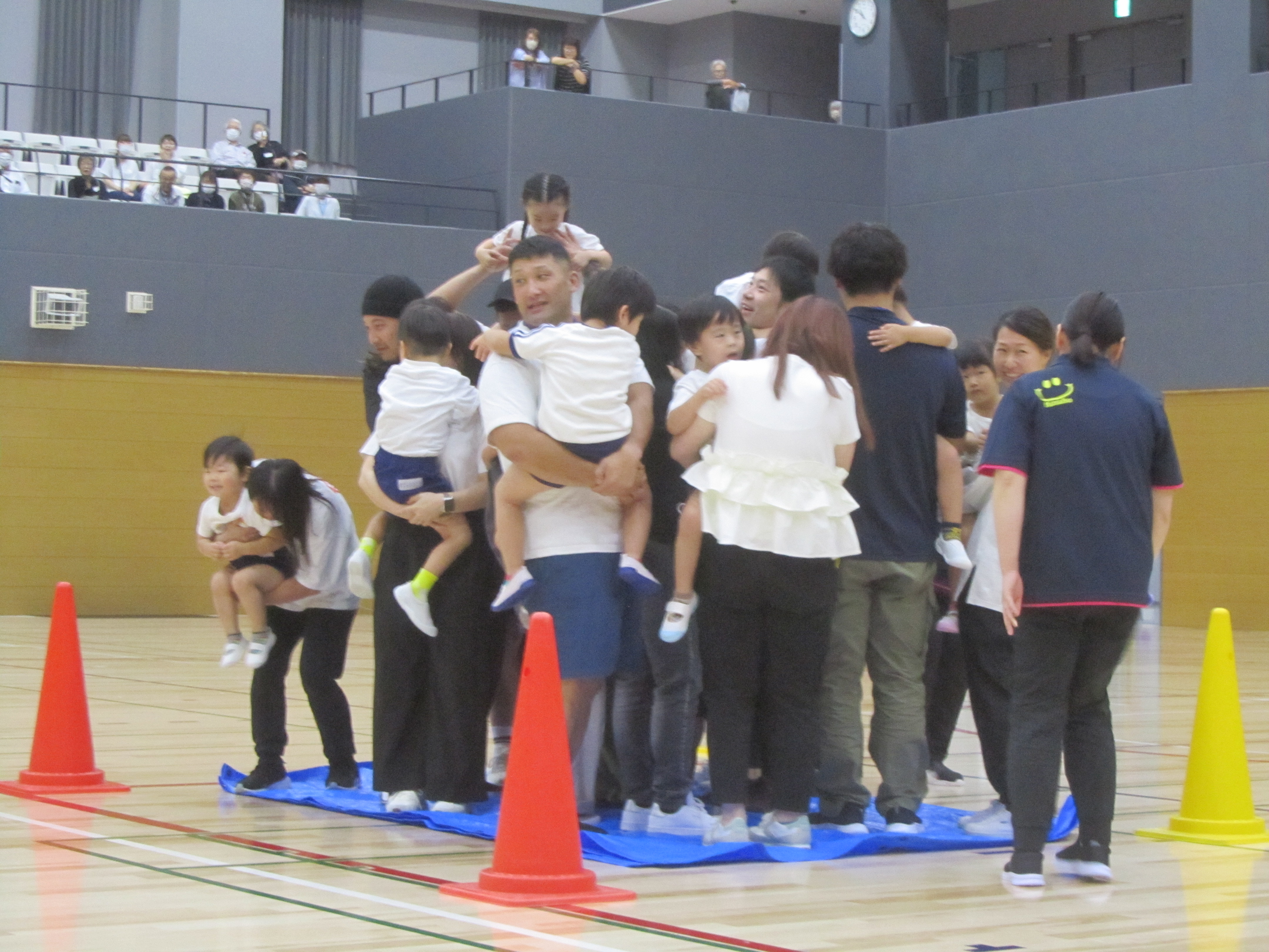 3歳児陣取りゲーム。4歳児バルーン。5歳児デカパン競争。最後は親子体操もあり、最後まで笑顔溢れる時間となりました。